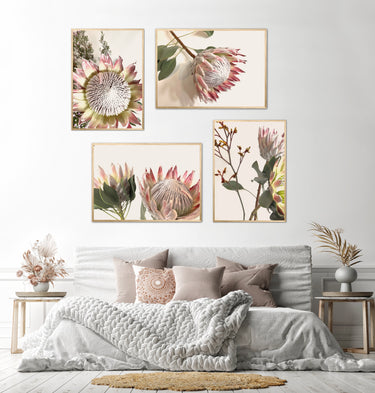 Elegant protea gallery wall art. Soft hues, floral beauty, and serene charm