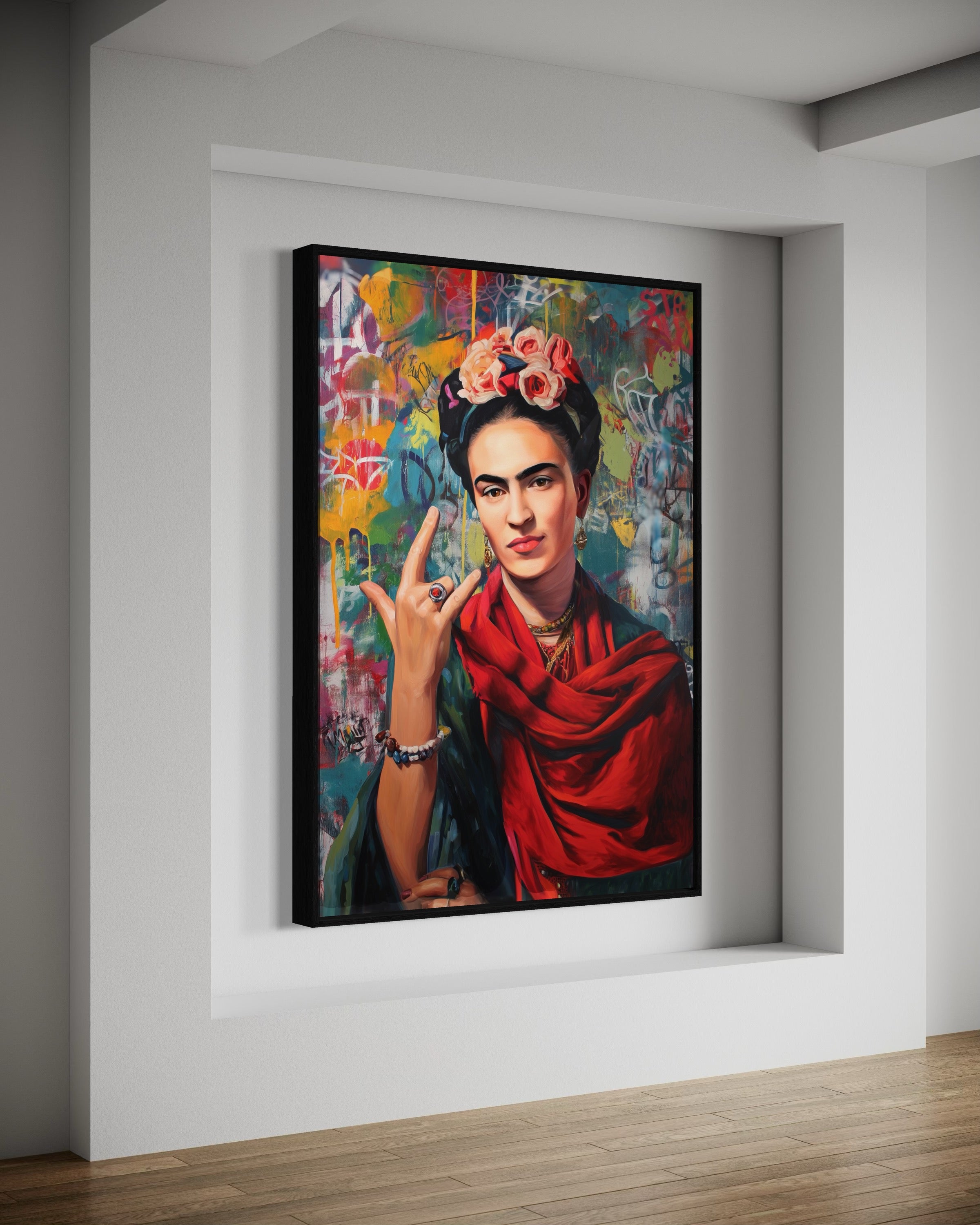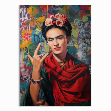 Classic meets counterculture in “Girl with the Street Vibe” — a rebellious remix of Vermeer’s iconic Girl with a Pearl Earring. This bold artwork transforms the serene elegance of the original into a modern-day street queen, flashing the “rock on” hand sign against a raw, graffiti-splashed wall.