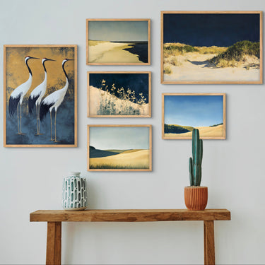 “Sunlit Solitude” is a curated collection that captures the quiet poetry of golden landscapes and still coastal moments. From soft, rolling dunes to windswept grasses and graceful cranes, each piece evokes the hush of wide-open spaces bathed in gentle sunlight. This curated set celebrates the beauty of stillness, the kind found in nature’s most peaceful corners, where time seems to slow and the soul can exhale. Ideal for creating a calming atmosphere, “Sunlit Solitude” invites a sense of reflection and restful escape into any living space.