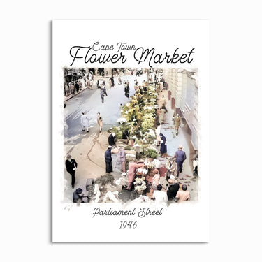 Step into the charming world of Cape Town’s Flower Market on Parliament Street in 1946. This print showcases a bustling scene of vibrant blooms and eager vendors, capturing the timeless beauty and lively spirit of a city in full bloom.