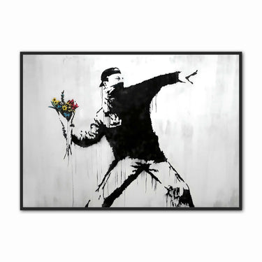 The Banksy "Flower Thrower" artwork on canvas or paper is a striking image that juxtaposes a masked figure in a rioter's pose with a bouquet of flowers being thrown instead of a molotov cocktail. This iconic piece is a powerful symbol of peace, non-violence, and resistance. It challenges the viewer's perception of conflict and sends a message of hope and compassion even in the midst of turbulent times.