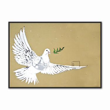 "Armored Dove of Peace" by Banksy is a striking artwork that juxtaposes the traditional symbol of peace, the dove, with a militarized and armoured appearance. The image portrays a dove wearing a bulletproof vest, challenging conventional notions of peace and highlighting the enduring presence of conflict in society. Through this powerful imagery, Banksy provokes viewers to question the complexities and contradictions surrounding the pursuit of peace in a world marked by violence and division.