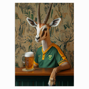Raise a glass with the proud Springbok as he enjoys a refreshing beer, dressed in the iconic green and gold of the South African rugby team. This fun and quirky print captures the essence of South African rugby culture and brings a playful charm to your space, perfect for sports fans and those who appreciate a touch of humour.