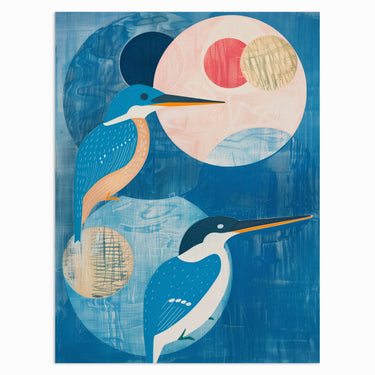 “Celestial Kingfishers” captures the serene beauty of two kingfishers, set against a backdrop of soft celestial shapes and hues. The cool blues and vibrant pinks of the birds bring a sense of calm and wonder, making this piece perfect for those seeking to bring nature-inspired tranquility into their space. The abstract elements add a modern twist, creating a harmonious blend of wildlife and contemporary design.