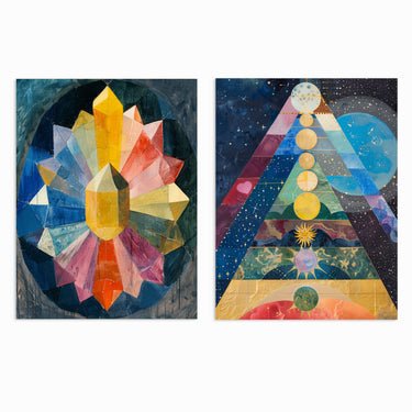 The “Celestial Spectrum Set” blends cosmic wonder and vibrant color in two mesmerizing artworks. With intricate designs that explore both the mystical and geometric, this set transports viewers into a world of astral beauty and spiritual energy. Perfect for those who are drawn to celestial themes and modern, abstract art, this collection brings a sense of wonder and enlightenment to any space.