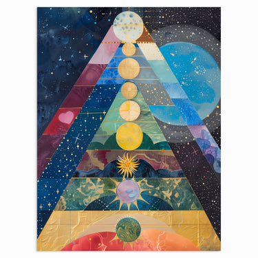 “Chakra Pyramid” guides you through a cosmic journey with its pyramid-like structure representing the alignment of the chakras, each layer corresponding to a different energy center. The vibrant celestial imagery and detailed geometric composition evoke a sense of harmony and spiritual balance. Perfect for those who are drawn to the mystical and seek to create a peaceful, energetically balanced space.