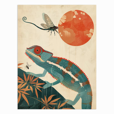 “Chameleon Sunset” is a vibrant and captivating piece of art that brings the exotic allure of nature into your space. This artwork features a meticulously detailed chameleon perched against a backdrop of lush foliage, with the sun setting in warm, earthy tones. The rich textures and dynamic composition create a sense of movement, as if the chameleon is about to pounce on the insects fluttering nearby. Perfect for adding a touch of the wild to your home or office, this print offers a unique blend of vibrant colours and intricate details that will capture the attention of anyone who sees it. Ideal for nature lovers, this artwork is a celebration of the beauty and complexity of the natural world.