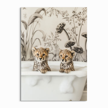 Introduce “Cheetah Cub Bath” into your bathroom decor, an enchanting art print from the “Bath Time Friends” collection. This whimsical print features two adorable cheetah cubs enjoying a playful bubble bath in a vintage-style bathtub, set against a delightful botanical backdrop. The charming details and monochromatic tones create a unique blend of playful relaxation and sophisticated design, making this print perfect for adding a touch of whimsy and charm to your bathroom. Ideal for children’s spaces or any room that could use a bit of cheerful energy, “Cheetah Cub Bath” brings a smile to every face and transforms your space into a haven of whimsical serenity.