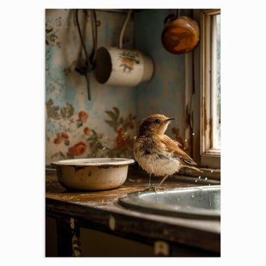 A charming moment unfolds in this art piece as a little bird splashes around in a rustic sink. Surrounded by vintage floral wallpaper and worn kitchenware, the bird seems to be enjoying a refreshing bath. Perfect for adding a nostalgic, countryside touch to your home.