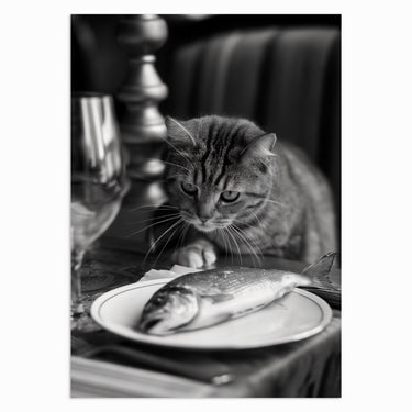 Featuring an inquisitive cat inspecting a freshly served fish on a plate, this black-and-white print highlights the quirky relationship between curiosity and nature. The cat’s concentrated stare adds a playful element to any room, whether it’s for a kitchen, living space, or study. “Curious Catch” is an ideal artwork for animal enthusiasts or those seeking a lighthearted twist in their décor.