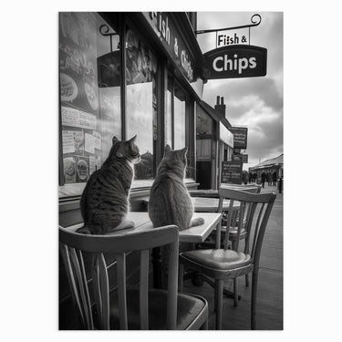 Capturing a moment of quiet anticipation, “Fish & Chips Duo” presents two cats seated by a fish & chips shop, looking out as if waiting for their order. This monochrome print is perfect for adding a touch of charm and whimsy to your kitchen or dining area, combining humor and feline curiosity.