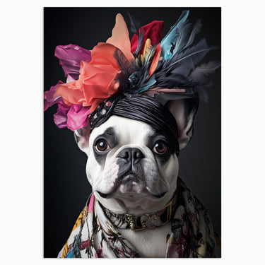 This fashionable French Bulldog is all dressed up with a colourful feathered hat, exuding elegance and charm. Perfect for dog lovers, this print adds a quirky and stylish vibe to your living space. Whether it’s for a kids’ room or a kitchen, this fun portrait adds a unique personality to your home décor.