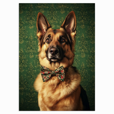 “German Shepherd Elegance” captures the poise and dignity of this regal breed, featuring a German Shepherd wearing a floral bow tie against an ornate green backdrop. The intricate design highlights the dog’s commanding presence, making it a perfect addition for dog lovers seeking a touch of sophistication in their décor.