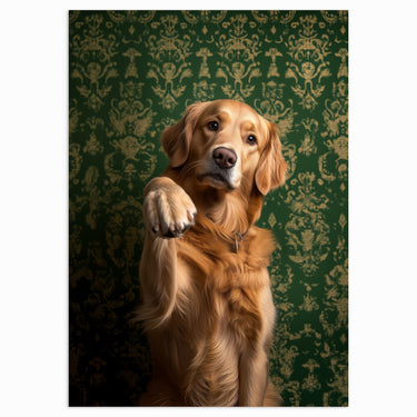 “Golden Pawshake” captures the heartwarming charm of a golden retriever offering its paw in a friendly greeting. Set against a regal green wallpaper, this print exudes warmth and sophistication, perfect for any dog lover’s home.