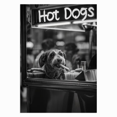 This adorable dog enjoying a hot dog from a street vendor’s stall is the perfect piece for anyone who loves a mix of street photography and whimsical animal scenes. The fun and quirky black-and-white shot captures the joy of simple pleasures, making it a delightful addition to any home.