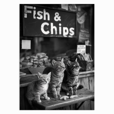 “Hungry Kittens” is an endearing black-and-white print showcasing three wide-eyed kittens eagerly eyeing a delicious fish & chips feast. Their adorable expressions and the vintage shop setting make this artwork a heartwarming addition to any space, bringing light-hearted fun and warmth to your walls.