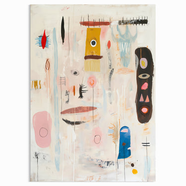 "I See You" is an artwork featuring abstract eye and mask motifs against a beige background, highlighted with vibrant accents of pink, mustard yellow, blue, and red. The bold colours and intricate designs create a dynamic composition that merges cultural elements with modern abstraction, evoking a sense of mystery and depth.