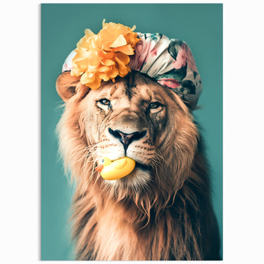 Introduce a dose of humour to your bathroom with 'King of the Bathroom,' a playful portrait of a lion sporting a shower cap and holding a rubber duck in his mouth. This amusing artwork captures the majestic king of the jungle in a hilariously unexpected moment, perfect for adding a smile to your face and a touch of fun to your space.