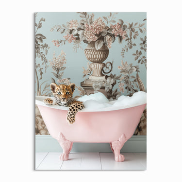 Introduce “Leopard’s Pink Bubble Bath” into your bathroom decor, an enchanting art print from the “Bath Time Friends” collection. This whimsical print features an adorable leopard cub enjoying a playful bubble bath in a vintage-style pink bathtub, set against an elegant floral backdrop. The soft colours and charming details create a unique blend of playful relaxation and sophisticated design, making this print perfect for adding a touch of whimsy and charm to your bathroom. Ideal for children’s spaces or any room that could use a bit of cheerful energy, “Leopard’s Pink Bubble Bath” brings a smile to every face and transforms your space into a haven of whimsical serenity.