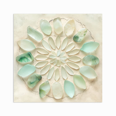 In Ocean Jewel, sea glass pieces are meticulously arranged in a radiant circular mandala. The gentle greens and milky whites evoke the treasures of the sea, while the mandala design speaks to the balance and beauty found in nature. This piece brings a coastal charm that adds a soothing, meditative vibe to your space.