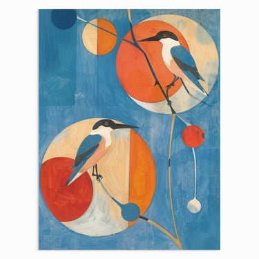 “Orbs of Flight” presents two birds gracefully perched amidst a series of abstract orbs in warm red and orange hues. The contrast between the deep blues and warm colors creates a dynamic composition that captures the beauty of flight and nature. This piece brings energy and movement to any room, perfect for those who love vibrant and bold designs.