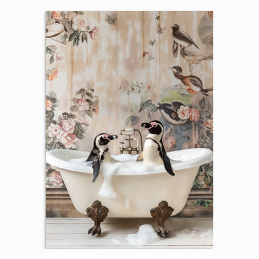 Two penguins enjoy a relaxing soak in a vintage clawfoot bathtub, set against a beautifully detailed wallpaper featuring birds and florals. The mix of elegance and playfulness in this print creates a charming scene that brings warmth and character to any room.
