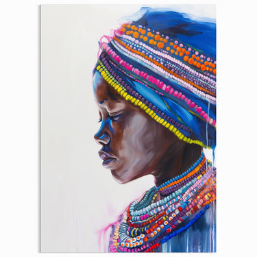 In "Quiet Contemplation," a young African girl dressed in a serene blue outfit adorned with colourful beads sits against a simple white background. Her expression is thoughtful and peaceful, inviting viewers to share in her moment of reflection. With each brush stroke, the painting captures the essence of tranquillity and inner contemplation, offering a glimpse into the quiet beauty of the human spirit.