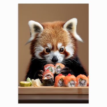This artwork showcases an adorable red panda enjoying a sushi roll with a look of wonder. The vibrant colors and attention to detail bring the red panda to life, making this print a delightful piece for dining areas, kitchens, or even children’s spaces. The whimsical scene offers a perfect blend of cuteness and culinary fun.