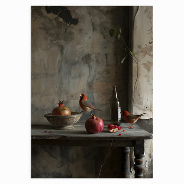 In a dimly lit room, two red-breasted birds enjoy a rustic feast of pomegranates. The minimalistic, earthy tones of the background bring focus to the vibrant red fruit and the birds’ rich feathers. This print evokes a sense of quiet indulgence and rustic charm.