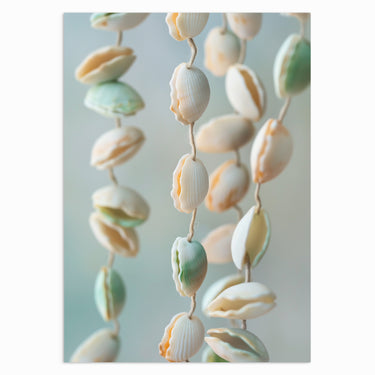 Delicate seashells dangle in an enchanting cascade, creating a soft, organic rhythm reminiscent of gentle waves. Each shell, naturally textured and tinted with pastel hues, is suspended as part of this tranquil, coastal-inspired art piece. This print is perfect for those who wish to bring the peace and beauty of the seaside into their home, offering a glimpse of nature’s simple yet captivating wonders.