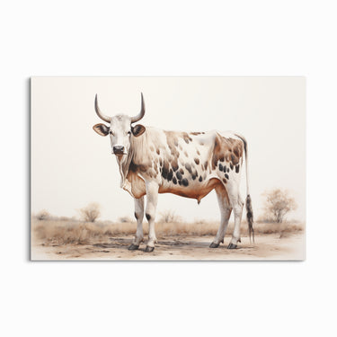 Celebrate the unique allure of African pastoral scenes with “Speckled Beauty.” This print features a striking Nguni cow adorned with a distinctive pattern of brown and white patches. Standing proudly in a sparse landscape, the cow embodies the resilience and beauty of traditional African breeds. Ideal for adding a touch of the exotic and a sense of calm to your home decor.