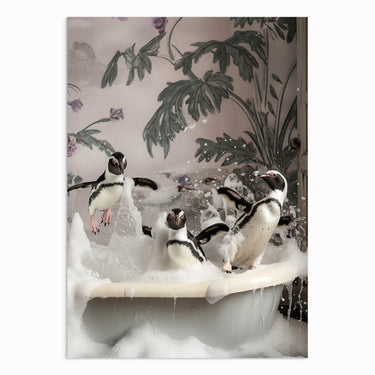 This delightful print captures a playful moment as four penguins frolic in a luxurious clawfoot bathtub, surrounded by bubbles. The elegant bathroom setting, complete with a crystal chandelier, contrasts beautifully with the penguins’ joyful antics, making it a whimsical yet sophisticated addition to any space.