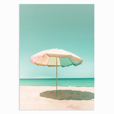 “Sun-kissed Shade” features a pastel beach umbrella casting a shadow over soft golden sand, evoking a sense of tranquillity and relaxation. The soft colours of the umbrella against the aqua sky create a dreamy, vacation-like atmosphere, perfect for anyone wanting to bring a touch of the beach into their home.