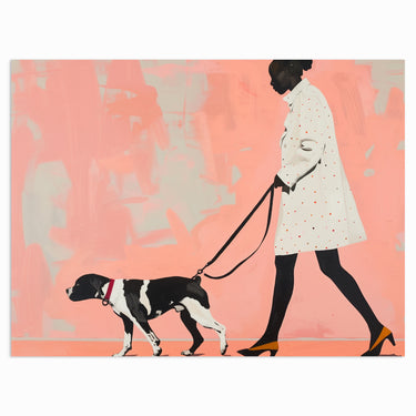 In “Sunset Stroll,” the vibrant coral backdrop creates a striking contrast with the black and white silhouette of a figure and their dog. The abstract elements and clean lines make this piece a bold statement that fits beautifully in a contemporary setting, bringing a touch of sunset warmth into your space.