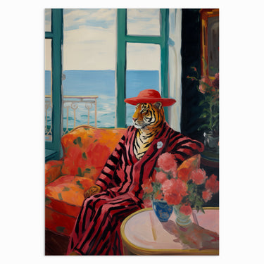 Even a tiger needs a day off to lounge in style. “Tiger’s Day Off” captures the majestic big cat in a moment of pure leisure, draped in a chic striped robe and enjoying the view from a cozy seaside villa. With a pop of red and a dash of sophistication, this playful print adds a splash of character and a sense of humor to any space, reminding us all to take time to relax and enjoy the finer things in life.