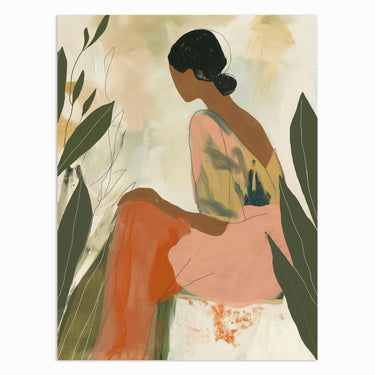 A serene depiction of a figure seated in solitude, surrounded by nature’s gentle embrace. The soft hues and flowing lines capture a moment of peaceful introspection, offering a calming presence to any space.