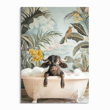 Add a touch of whimsy and charm to your bathroom with "Tropical Calf Bath," an enchanting art print from the "Bath Time Friends" collection. This delightful print features a cute calf enjoying a bubble bath in a vintage-style bathtub, set against a lush tropical backdrop with vibrant greenery and exotic birds. The vibrant colours and endearing details create a sense of playful relaxation, making this print perfect for adding warmth and joy to your bathroom decor. Ideal for children's spaces or any room that could use a bit of cheerful energy, "Tropical Calf Bath" brings a smile to every face and transforms your space into a haven of whimsical serenity. Celebrate the carefree spirit of this lovable calf with this captivating and heartwarming print.