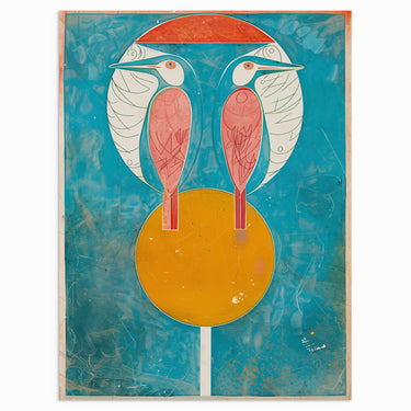 “Twin Guardians” features two beautifully detailed birds perched symmetrically on a golden sphere, set against a striking blue background. This artwork blends bold, vibrant colors with a clean, geometric design, symbolizing balance and protection. The unique style and strong visual contrast make it a perfect statement piece for any modern or eclectic space.