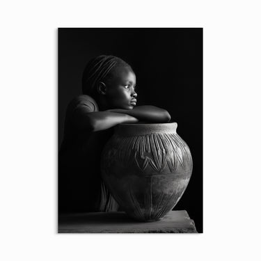 “Vessel of Heritage” presents a serene portrait of a young girl resting on a traditional African pottery vessel. The black-and-white composition emphasizes the timeless bond between the past and the present, where tradition and youth come together in a moment of quiet reflection. A stunning piece that speaks to the enduring beauty of cultural heritage.