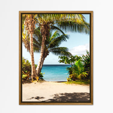 Bring the beauty of the beach to your home with this vibrant tropical beach wall art. Featuring an inviting turquoise sea and a palm-framed horizon, this piece of art captures the essence of a stunning tropical paradise.