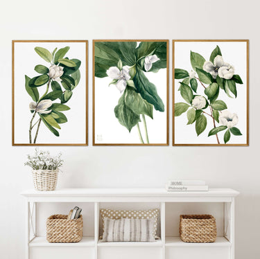 Add a touch of vintage charm to your decor with this set of 3 flower paintings. The muted green and white hues evoke a timeless sensibility, while the subjects add a touch of nature's beauty to any interior. A perfect addition to any living space.