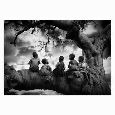 This evocative black-and-white photograph, titled Waiting for the Rain, captures a timeless moment of anticipation as five children sit atop a large baobab tree, gazing into the distance. Their quiet stillness contrasts beautifully with the dramatic sky, invoking the anticipation of rainfall and the enduring connection between nature and humanity. This piece brings a sense of peace, reflection, and the powerful bond between people and the African landscape. Perfect for spaces that seek to evoke thoughtfulness and beauty in simplicity.