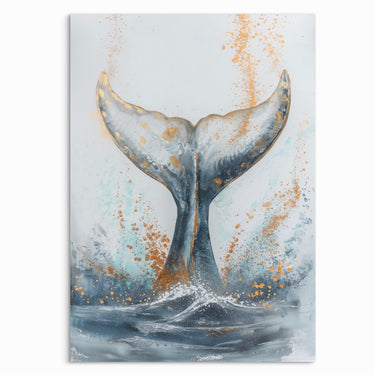 Celebrate the majesty of the ocean with “Whale Tail Symphony.” This artwork captures the moment of a whale’s graceful dive, its tail breaking through the surface with splashes of gold and blue. The delicate balance of colors and movement makes this piece a beautiful addition to any coastal-themed interior.